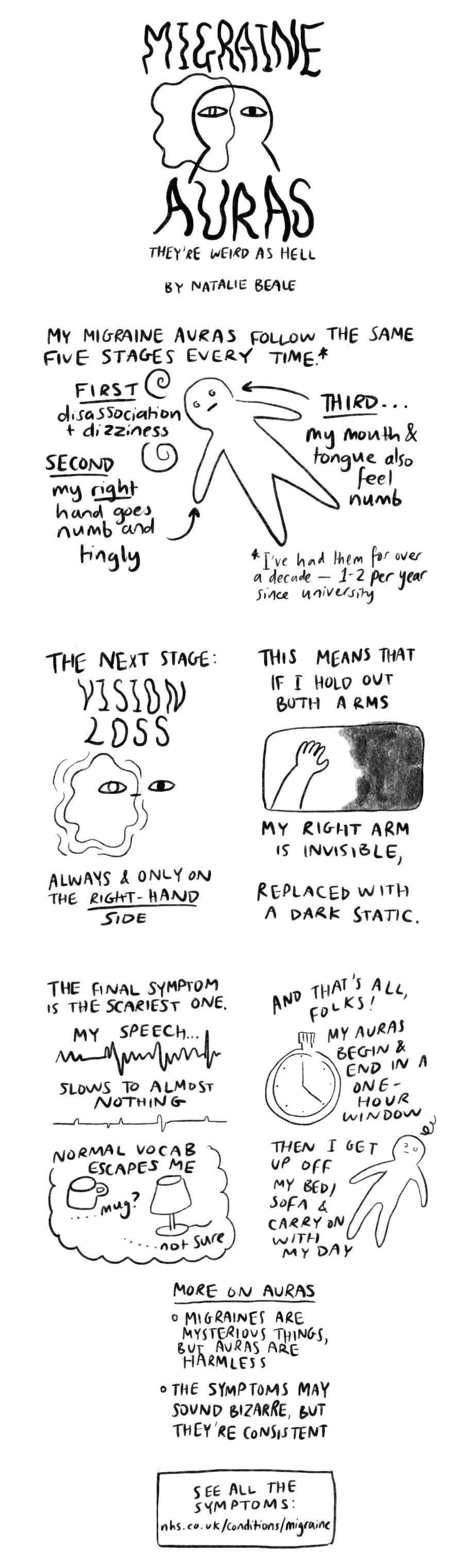 Here’s that NHS link for you — my first migraine aura caused me to panic a bit (as you would!) but the GP told me what it was. When I first visited that NHS page and read the description of symptoms, I could hardly believe all of the weird things I experienced were listed in full. Brains are weird!!!